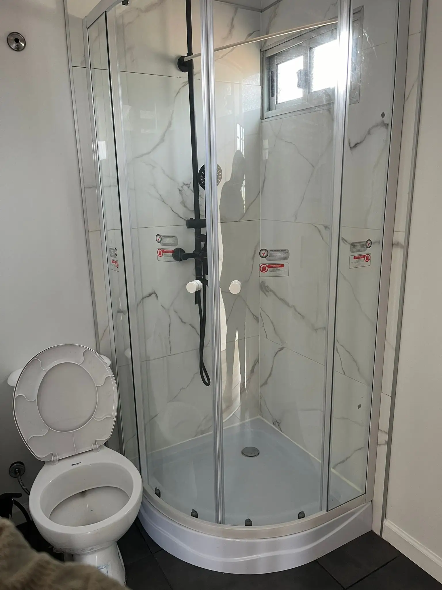 Baño con cabina de ducha semicircular, grifería negra y revestimiento símil