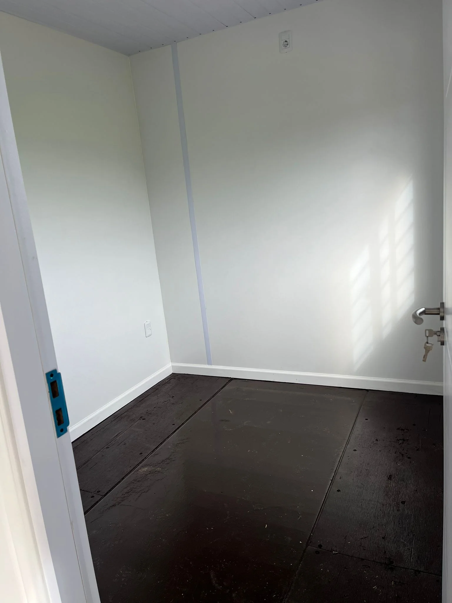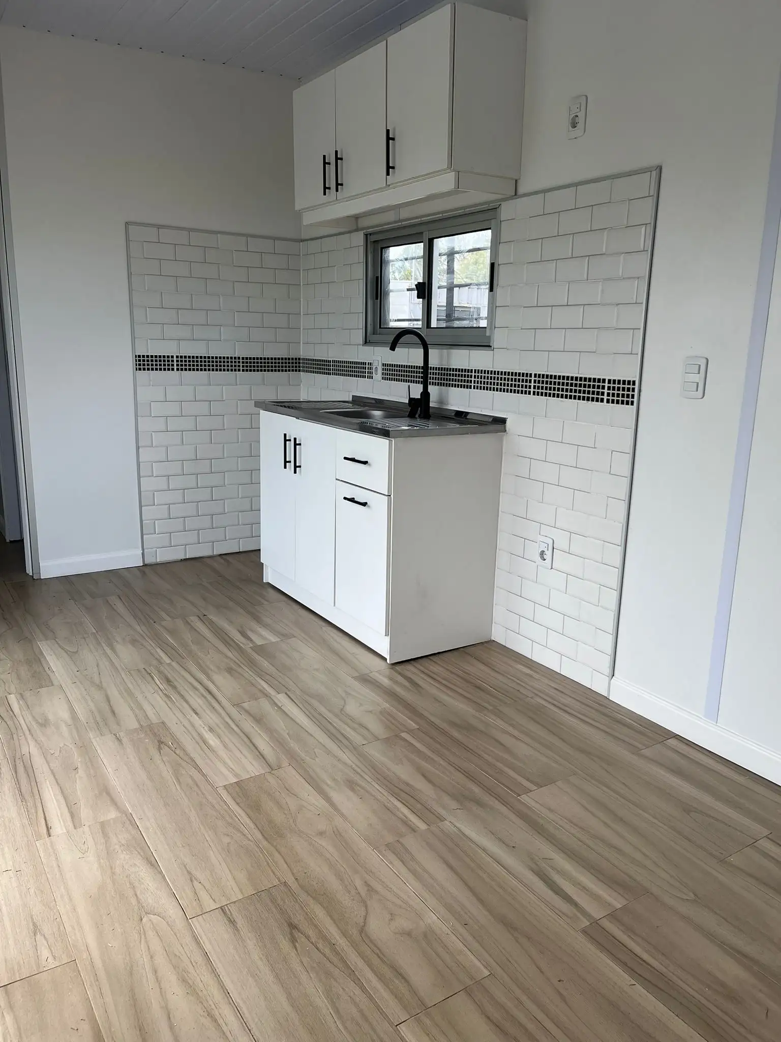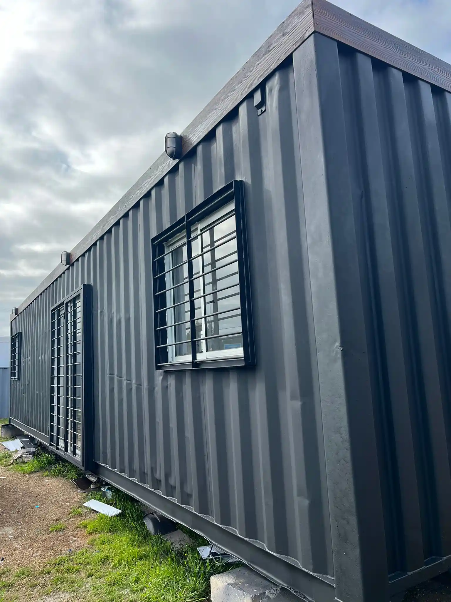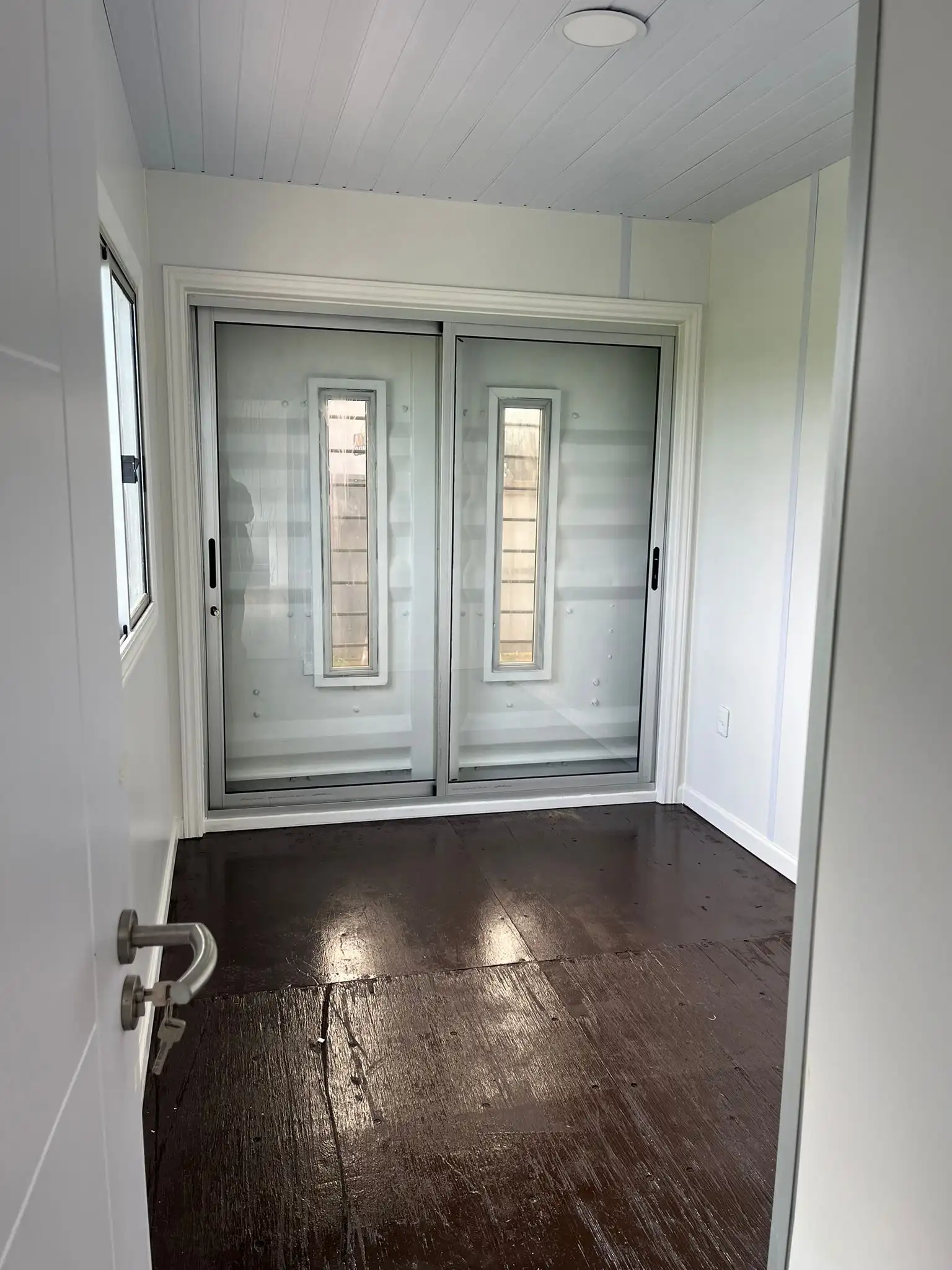 Unidad de 30 m² recién instalada: 2 dormitorio, 1 baño con cabina y cocina blanca con salpicadero negro. Pisos porcelanato marmolado, rejas en aberturas y corredor vidriado. Ideal vivienda compacta u oficina; transporte e instalación en horas.