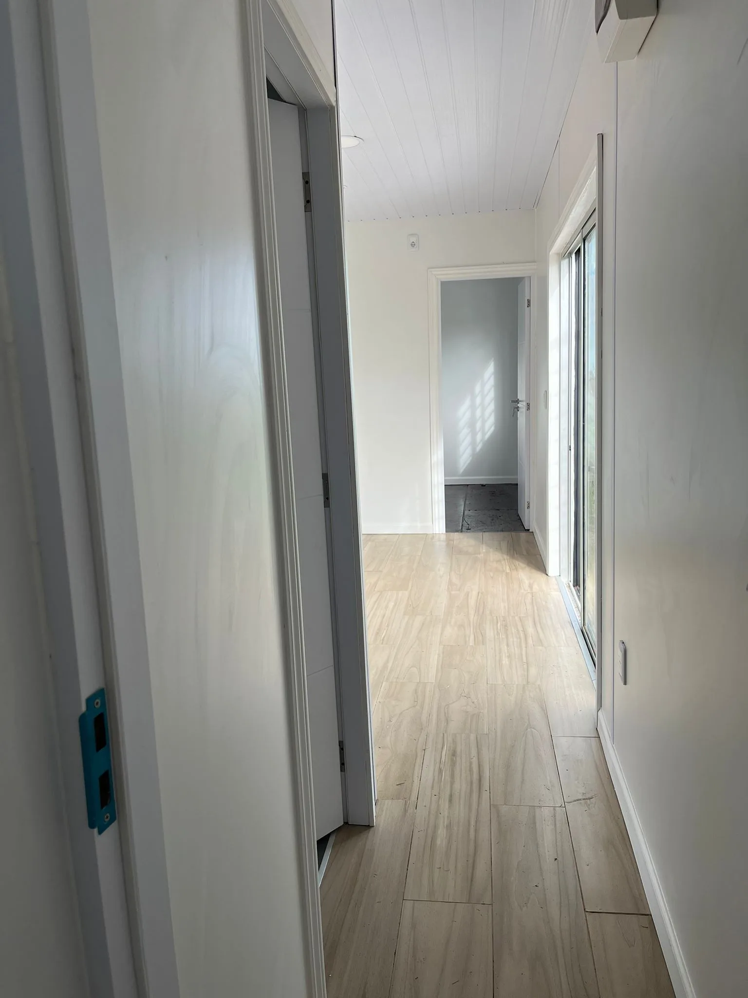 Pasillo con luz natural que vincula áreas y salida lateral.