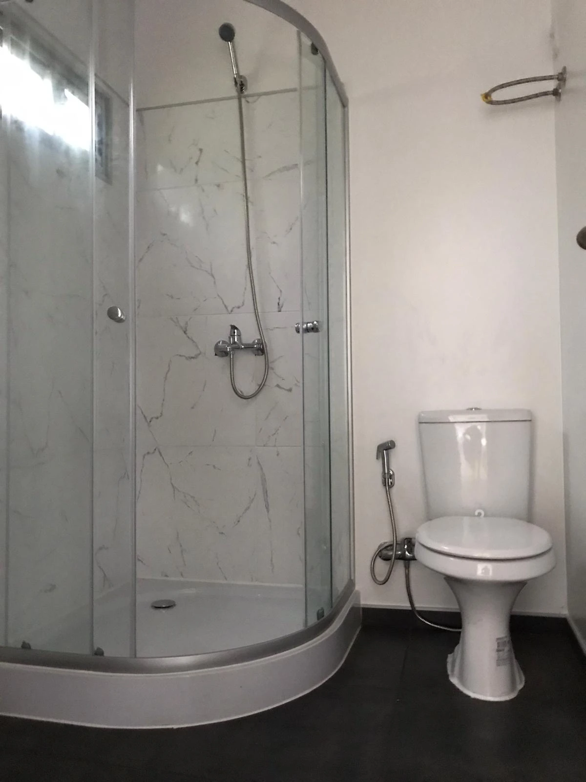 Baño completo con cabina de ducha semicircular y grifería, casa contenedor 45 m².