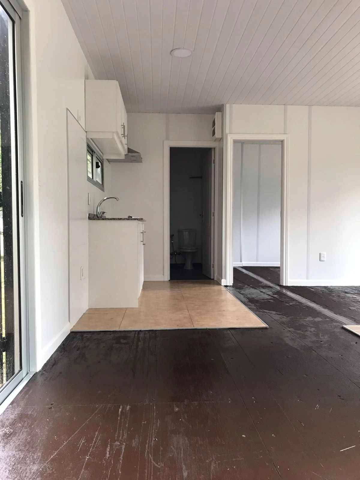 Modelo terminado de 45 m² pensado para familias: dos dormitorios privados, baño completo y un living-comedor con cocina y barra que suman superficie de trabajo y guardado. Ventanas con rejas, buena iluminación y pisos resistentes. Ideal como vivienda principal o cabaña de renta, lista para colocar.