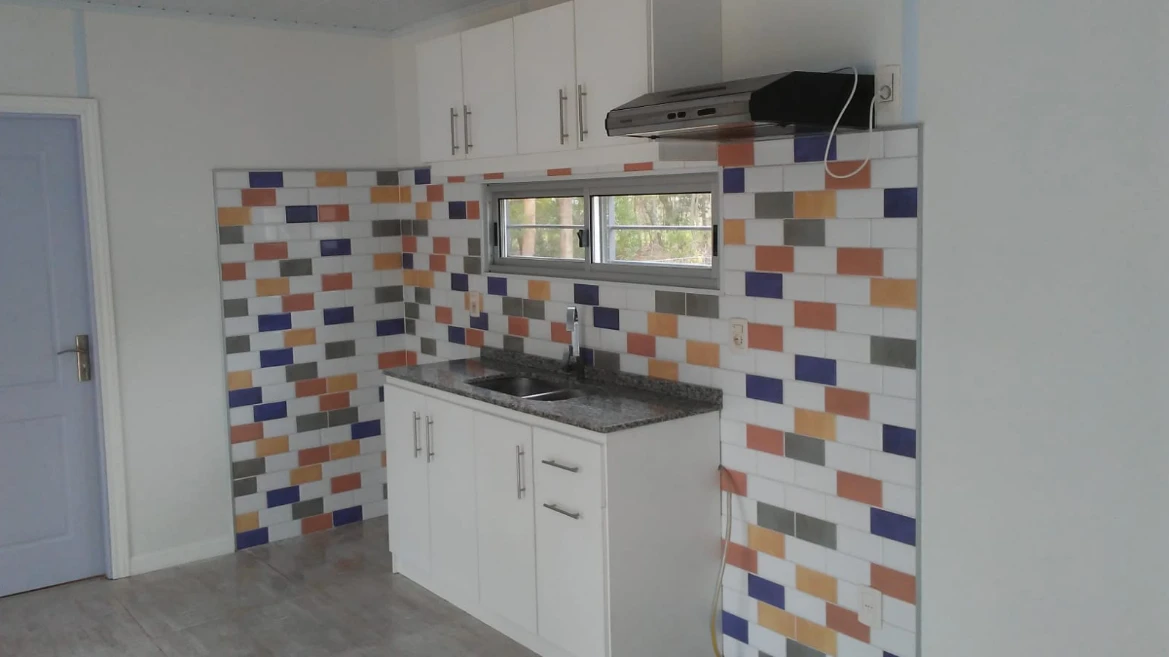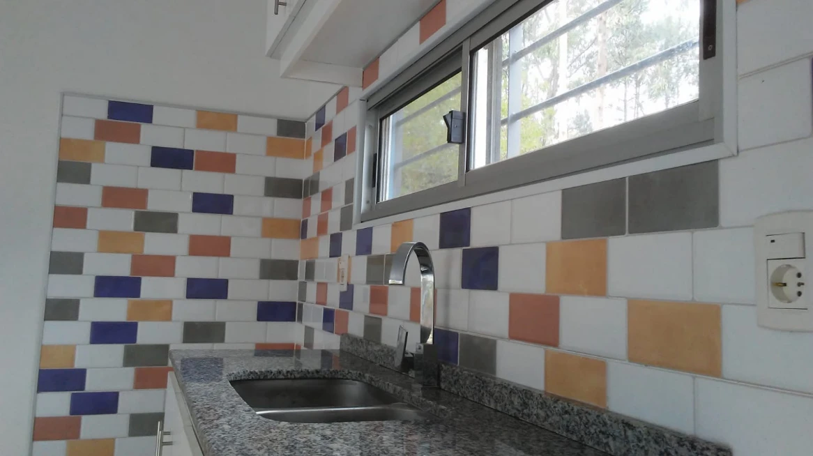 Detalle de cocina con revestimiento cerámico multicolor y mesada de granito.
