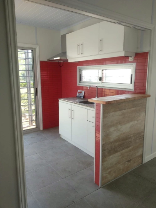 Cocina compacta con barra, muebles blancos y cerámica roja — casa contenedor 75 m².