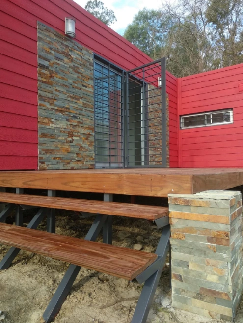 Vista general: deck de madera, siding rojo y detalles en piedra — 75 m².