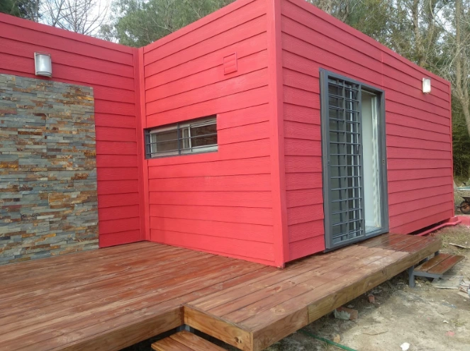 Fachada en siding rojo con ventana horizontal y puerta ventana hacia el deck — 75 m².