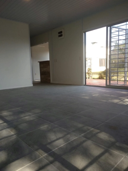 Living-comedor amplio con piso cerámico y salida al deck mediante puerta ventana.